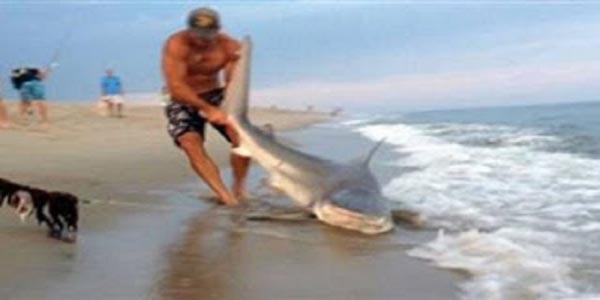 Χωρίς να φοβηθεί ο ψαράς άρπαξε τον καρχαρία, μήκους 2,1 μέτρων, από την ουρά και τον έβγαλε στην ακτή!