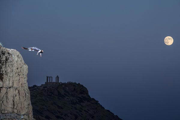 Ο Κολομβιανός πρωταθλητής του «Red Bull Cliff Diving World Series», εκτέλεσε μια απίστευτη βουτιά υπό το φως της Αυγουστιάτικης πανσελήνου. Ο επιβλητικός ναός του Ποσειδώνα, οι απόκρημνοι βράχοι, το βαθύ μπλε της θάλασσας και ένα μαγικό φεγγάρι, έγιναν μάρτυρες της άρτια εκτελεσμένης «χορογραφίας» του Orlando Duque.