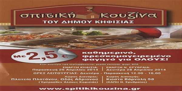 Από την Παρασκευή 25 Απριλίου θα ξεκινήσει να λειτουργεί στην Κηφισιά και από τη Δευτέρα 28 Απριλίου στη Νέα Ερυθραία, καθημερινά από Δευτέρα έως Παρασκευή από τις 12:00 έως 16:00, η «Σπιτική Κουζίνα» του Δήμου Κηφισιάς.