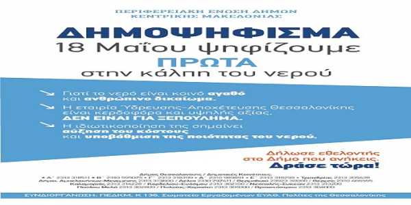 Με το επιχείρημα ότι το νερό είναι κοινό αγαθό και ανθρώπινο δικαίωμα, η ΕΥΑΘ είναι κερδοφόρα και υψηλής αξίας επιχείρηση και άρα δεν είναι για ξεπούλημα, καθώς και ότι η ιδιωτικοποίησή της σημαίνει αύξηση του κόστους και υποβάθμιση της ποιότητας του νερού, οι διοργανωτές καλούν τους πολίτες – εκλογείς στους δήμους Θεσσαλονίκης, Αμπελοκήπων- Μενεμένης, Δέλτα, Θερμαϊκού, Θέρμης, Καλαμαριάς, Κορδελιού-Ευόσμου, Νεάπολης –Συκεών, Παύλου Μελά, Πυλαίας – Χορτιάτη, Ωραιοκάστρου να συμμετάσχουν στο τοπικό δημοψήφισμα για να αποτραπεί η ιδιωτικοποίηση του νερού.