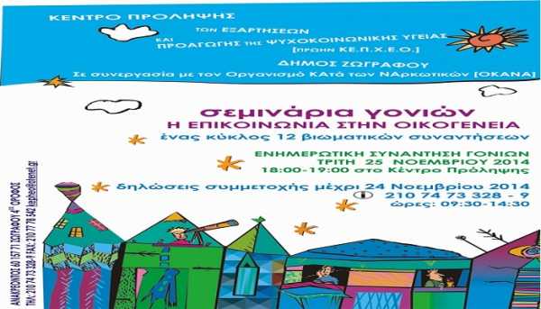 Για την καλύτερη ενημέρωση των γονιών θα πραγματοποιηθεί ενημερωτική συνάντηση την Τρίτη 25 Νοεμβρίου και ώρα 18:00 με την υπεύθυνη των σεμιναρίων Βάνα Καρασιώτου στο χώρο του Κέντρου Πρόληψης, Ανακρέοντος 60, 4ος όροφος. Στη συνάντηση θα αποσαφηνισθούν απορίες και θα προγραμματισθούν από κοινού οι ώρες λειτουργίας των σεμιναρίων.