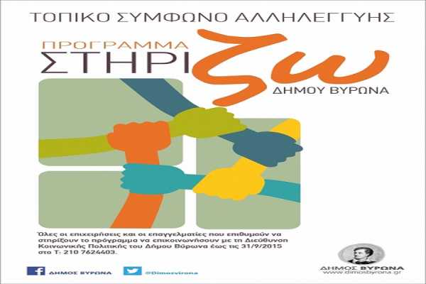 Ο Δήμος Βύρωνα θα επαναλειτουργήσει το πρόγραμμα «ΣΤΗΡΙΖΩ», στην τοπική κοινωνία μας, ένα πρόγραμμα που στόχο έχει όλοι οι Δημότες του Βύρωνα και ιδιαίτερα οι ευπαθείς κοινωνικά ομάδες, εφοδιασμένοι με ειδική κάρτα από την κοινωνική υπηρεσία, να έχουν έκπτωση σε καταναλωτικά αγαθά που προμηθεύονται από καταστήματα και επιχειρήσεις του Βύρωνα.