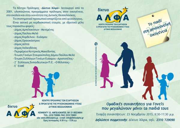 Δήμος Παύλου Μελά: Ομαδικό Εργαστήρι ''Το παιδί στη μονογονεϊκή οικογένεια'' Το Κέντρο Πρόληψης "Δίκτυο Άλφα" διοργανώνει για πέμπτη χρονιά Ομαδικό Εργαστήρι για Γονείς που μεγαλώνουν μόνοι τα παιδιά τους με τίτλο "Το παιδί στη μονογονεϊκή οικογένεια". Το Ομαδικό Εργαστήρι θα ολοκληρωθεί σε 10 δίωρες συναντήσεις με συχνότητα μία φορά την εβδομάδα, κάθε Δευτέρα 9.30 με 11.30 το πρωί, στο χώρο του Δικτύου Άλφα, Κέννεντυ 32 Αμπελόκηποι