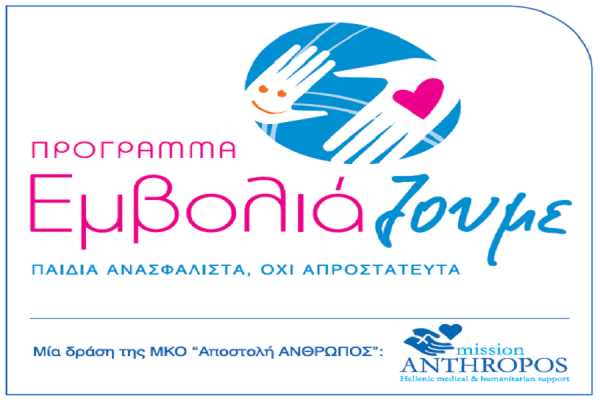 Παράλληλα με τις δράσεις στο εξωτερικό η οργάνωση Αποστολή ΑΝΘΡΩΠΟΣ δραστηριοποιείται από το 2012 και στην Ελλάδα με σκοπό την υποστήριξη των δοκιμαζόμενων συμπολιτών μας στα πλαίσια της οικονομικής και κοινωνικής κρίσης. Σαν πρώτη προτεραιότητα έχει τεθεί ο εμβολιασμός παιδιών ανασφάλιστων Ελλήνων και μεταναστών, με το πρόγραμμα «Εμβολιά-ζουμε: Παιδιά ανασφάλιστα, όχι απροστάτευτα» όπου η οργάνωση συμβάλλει με την συμμετοχή των εθελοντών και την προσφορά των εμβολίων. Η εθελοντική ομάδα απαρτίζεται από παιδίατρους, νοσηλευτές και λοιπούς εθελοντές. Το πρόγραμμα χρηματοδοτείται από το Ίδρυμα Μποδοσάκη (www.bodossaki.gr), το Ίδρυμα Σταύρος Νιάρχος (www.snf.org), το Κοινωφελές Ίδρυμα Ιωάννη Σ. Λάτση (www.latsis-foundation.org) καθώς και από ιδιώτες.
