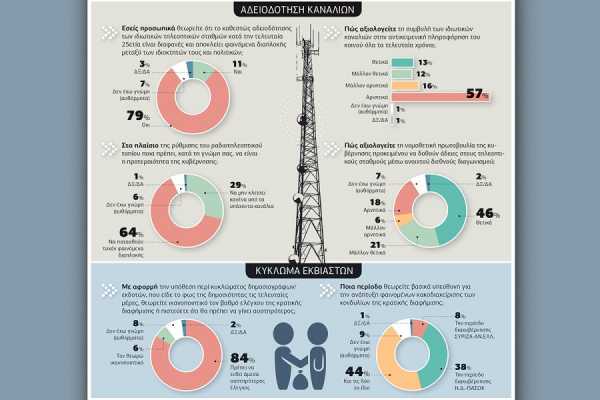 Για την αδειοδότηση των καναλιών: Το 79% των Ελλήνων πιστεύει ότι το καθεστώς λειτουργίας των ιδιωτικών καναλιών την τελευταία 25ετία δεν είναι διαφανές και δεν αποκλείει φαινόμενα διαπλοκής. Ποσοστό 73%, κρίνει αρνητική τη συμβολή των καναλιών στην αντικειμενική πληροφόρηση του κοινού, 64% εκτιμά ότι προτεραιότητα της κυβέρνησης στο πλαίσιο της ρύθμισης του τηλεοπτικού τοπίου πρέπει να είναι η πάταξη των φαινομένων διαπλοκής. Μόνο το 29% θεωρεί προτεραιότητα να μην κλείσει κανένα από τα υπάρχοντα κανάλια. Το 67% θεωρεί θετική την πρωτοβουλία της Κυβέρνησης να προχωρήσει στην αδειοδότηση μέσω διεθνούς διαγωνισμού.