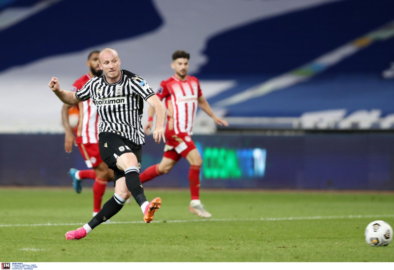 Ο ΠΑΟΚ πλησίασε το γκολ με κεφαλιά του Σβιντέρσκι στο δοκάρι στο 26΄ και δέκα λεπτά αργότερα άνοιξε το σκορ, όταν ο Σβαμπ βγήκε πρώτος στη μπάλα μέσα στην περιοχή, ο Εμβιλά βρήκε το πόδι του Αυστριακού και ο Μακέλι έδειξε την άσπρη βούλα, που μετέτρεψε σε γκολ ο Βιεϊρίνια.