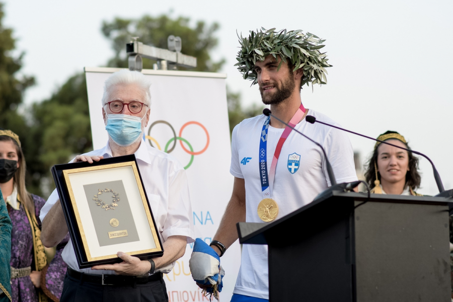 Ο δήμαρχος της πόλης έστεψε με κότινο από κλαδί ελιάς τον Ολυμπιονίκη, ενώ ο περιφερειάρχης του δώρισε μία εικόνα της Παναγίας.