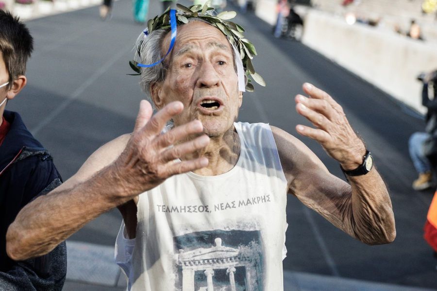 Ο κ. Στέλιος κατάφερε και τερμάτισε στον μαραθώνιο, και τον αγκάλιασαν τα εγγόνια του, ενώ η πρόεδρος του ΣΕΓΑΣ Σοφία Σακοράφα του έβαλε ένα στεφάνι από κλαδιά ελιάς στο κεφάλι.