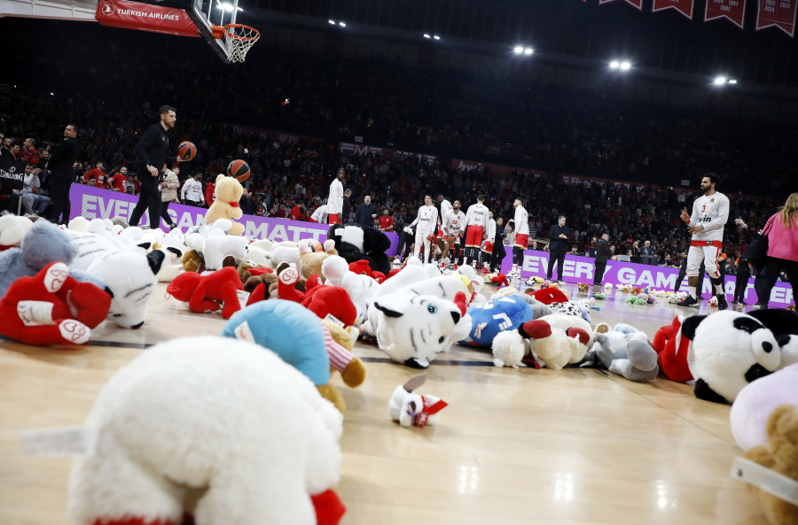 Όταν δόθηκε το σχετικό σύνθημα, μετά την παρουσίαση των δύο ομάδων, «έβρεξε» λούτρινα παιχνίδια στο ΣΕΦ, καθώς οι φίλαθλοι ανταποκρίθηκαν στο κάλεσμα των «ερυθρολεύκων» και έστειλαν ένα ηχηρό μήνυμα αγάπης.