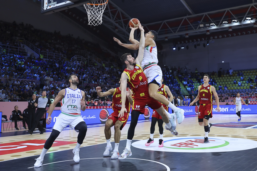 Η δυναμική εκκίνηση της Ισπανίας, όταν έγραψε στα μισά της πρώτης περιόδου στον φωτεινό πίνακα το υπέρ της 13-0 (!), γρήγορα καλύφθηκε από την κυριαρχία της Ιταλίας στα ριμπάουντ, την αμυντική της προσήλωση και την κυριαρχία των Ντιούφ (14π., 8ρ.), Νιανγκ (10π., 10ρ.) στην επίθεση. Η «σκουάντρα ατζούρα» άρχισε σταδιακά να... ροκανίζει τη διαφορά, για να έρθει η τρίτη περίοδος και να πετύχει την ανατροπή με 49-47, μετά από επιμέρους σκορ 19-11 σε αυτό το διάστημα.