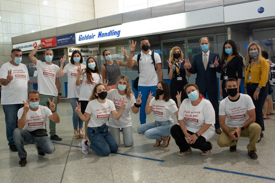 Οι εθελοντές της ομάδας Κωτσόβολος με την Κατερίνα Στεφανίδη, τον Εμμανουήλ Κάραλη και την ομάδα του Διεθνή Αερολιμένα Αθηνών