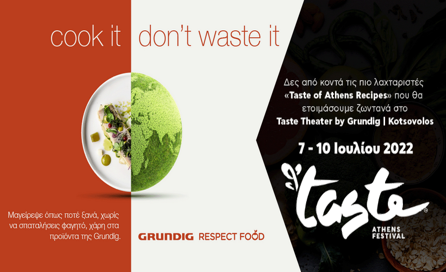 Με μότο «Σεβόμαστε το φαγητό / Respect Food» και στόχο την εκπαίδευση γύρω από τη σημασία και την ενεργό δράση για τη μείωση της σπατάλης τροφίμων, η Κωτσόβολος, Taste Theatre Presenting Partner και η Grundig, Official Equipment Sponsor θα «φιλοξενήσουν» για 4 ημέρες στη σκηνή του Taste Theater, αγαπημένους σεφ από κορυφαία αθηναϊκά εστιατόρια.