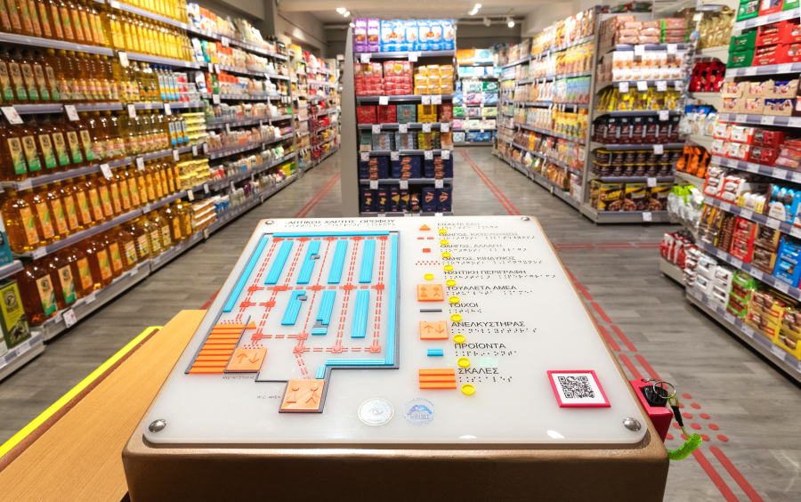 - Ο απτικοακουστικός χάρτης που δημιουργήθηκε με την πολύτιμη βοήθεια της e-Nable Greece. Με τη χρήση γραφής Μπράιγ ή με τη βοήθεια ενός στυλό που μπορεί να διαβάζει φωνητικά, δίνει νοητική κάτοψη ολόκληρου του καταστήματος.