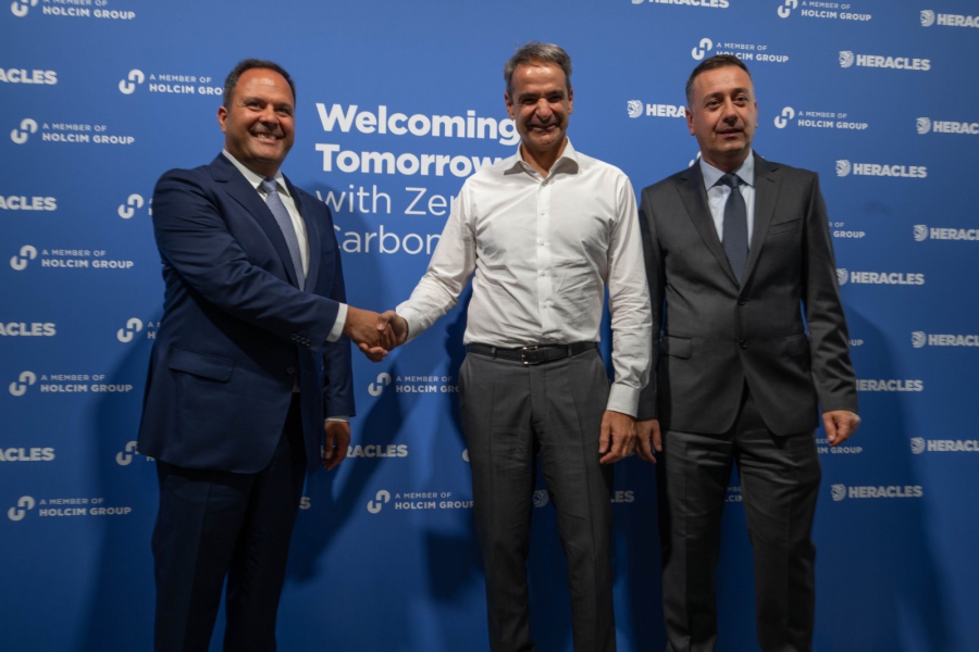 κ. Δημήτρης Χανής, Διευθύνων Σύμβουλος του Ομίλου ΗΡΑΚΛΗΣ, κ. Miljan Gutovic, Διευθύνων Σύμβουλος του Ομίλου Holcim, Πρωθυπουργός κ. Κυριάκος Μητσοτάκης