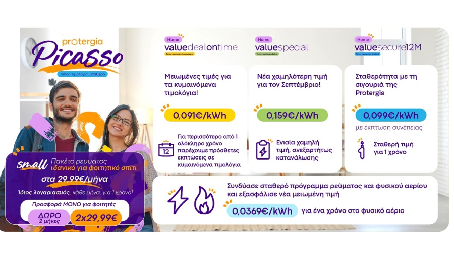Παράλληλα, συνεχίζει να προσφέρει το Protergia Picasso, το πιο πρωτοποριακό προϊόν στην Ελλάδα και το μοναδικό με πραγματικά ίδιο λογαριασμό κάθε μήνα. Ο καταναλωτής επιλέγει το ποσό που θα πληρώνει κάθε μήνα για το ρεύμα του, ανάλογα τις ανάγκες του μέσα από 9 διαφορετικά πακέτα, για έναν ολόκληρο χρόνο, καλύπτοντας το σύνολο των ενεργειακών χρεώσεων (ανταγωνιστικές και ρυθμιζόμενες)!