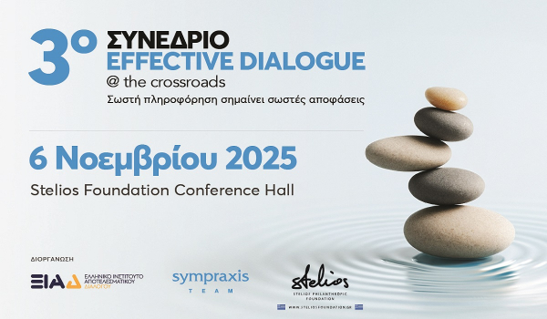 Η Sympraxis & το Ελληνικό Ινστιτούτο Διαβούλευσης με τη συνεργασία του Stelios Philanthropic Foundation διοργανώνουν στο Stelios Foundation Conference Hall στην Πλάκα, το 3ο Συνέδριο Effective Dialogue @ the crossroads, την Πέμπτη, 6 Νοεμβρίου 2025, αναδεικνύοντας τον κρίσιμο ρόλο του ανοιχτού και ουσιαστικού διαλόγου μεταξύ εταιρειών και κοινωνίας, εστιάζοντας σε θέματα βιωσιμότητας, κοινωνικής ευθύνης και περιβαλλοντικής δράσης. Κεντρικός στόχος του Συνεδρίου είναι να προκαλέσει τη γνήσια ακρόαση των αναγκών, των προσδοκιών και των προτάσεων των ενδιαφερόμενων μερών, φιλοδοξώντας να μετατρέψει τον διάλογο από μέσο εντυπωσιασμού σε μοχλό ουσιαστικών, μακροπρόθεσμων αλλαγών που δημιουργούν τη διαφορά.