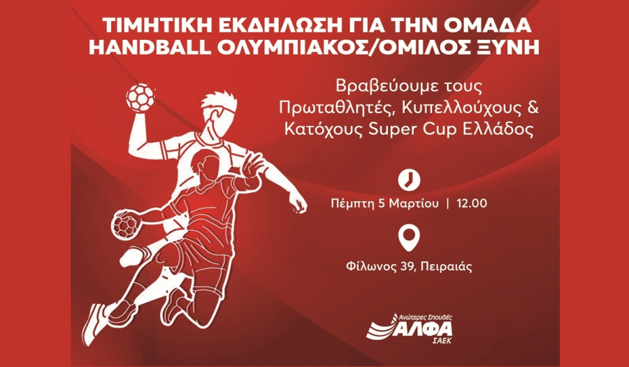 Οι «Πρωταθλητές» Εκπαίδευσης –και Υπερήφανοι Χορηγοί Εκπαίδευσης του ΟΛΥΜΠΙΑΚΟΥ/ΟΜΙΛΟΥ ΞΥΝΗ- θα τιμήσουν τους παίκτες και τους παράγοντες της ομάδας handball που μετρά 13 τίτλους σε μόλις 9 χρόνια, παρουσία εξεχουσών προσωπικοτήτων της πολιτικής και του αθλητισμού.