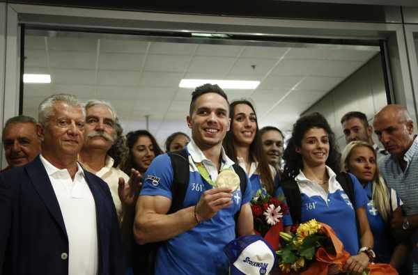 ¨Εφτασε στο αεροδρόμιο Ελ. Βενιζέλος ο χρυσός ολυμπιονίκης στους κρίκους, Λευτέρης Πετρούνιας, ενώ αυτή την ώρα μεταβαίνει μαζί με τους υπόλοιπους Ολυμπιονίκες στο Προεδρικό Μέγαρο.
