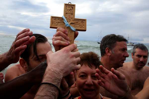 Βατραχάνθρωποι της Ομάδας Υποβρυχίων Αποστολών βούτηξαν στα παγωμένα νερά του λιμανιού για να πιάσουν το σταυρό ανάμεσα στα δύο ναρκαλιευτικά του πολεμικού ναυτικού «Καλυψώ» και «Καλιστω»