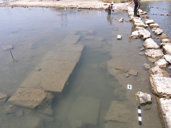 Σε μικρή απόσταση από τον μώλο στα δυτικά, αποκαλύπτεται, καταποντισμένη σήμερα, σε βουρκώδες περιβάλλον, μεγάλη στιβαρή κατασκευή, από λιθόπλινθους, επιμελούς εμφάνισης, σε μήκος 13 μ. Πρόκειται, κατά πάσα πιθανότητα, για κρηπίδα (με εντοπισμένη ισχυρή θεμελίωση στο νότιο σκέλος της) κτηριακής κατασκευής δημόσιου χαρακτήρα.