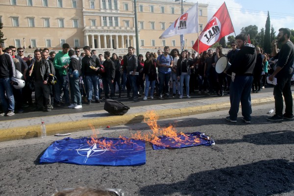 Μάλιστα όταν η πορεία τους έφτασε μπροστά από τη Βουλή έκαψαν σημαίες της ΕΕ και του ΝΑΤΟ.