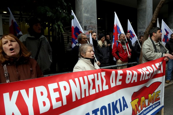 Παράσταση διαμαρτυρίας κατά των πλειστηριασμών πραγματοποιούν μέλη του ΠΑΜΕ έξω από τα γραφεία του συλλόγου συμβολαιογράφων.