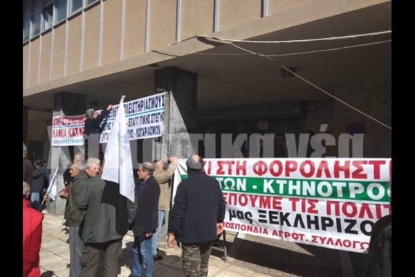 Οι συγκεντρωμένοι ύψωσαν πανό στην είσοδο της Υπηρεσίας με περιεχόμενο κατά της διαδικασίας των ηλεκτρονικών πλειστηριασμών και διένειμαν φυλλάδια σε πολίτες.