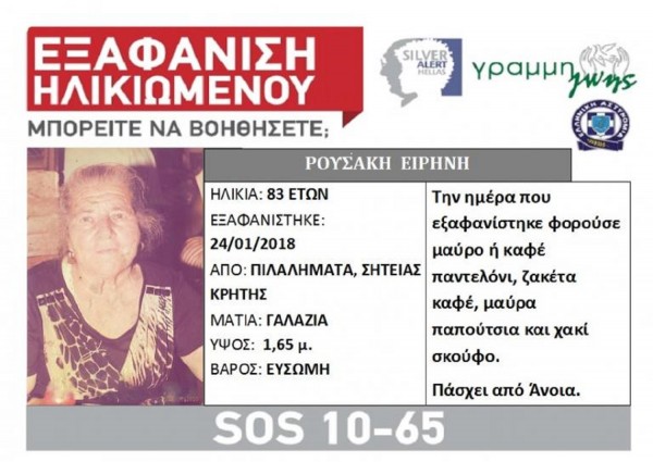 Κλήθηκε δε και ο εγγονός της της 83χρονης Ειρήνης Ρουσάκη, για την οποία έχει σημάνει Silver Alert από τις 24 Ιανουαρίου.