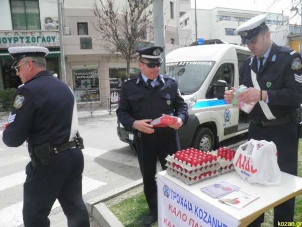 Κόκκινα αυγά και φυλλάδια μοίρασαν αστυνομικοί της Τροχαίας σε περαστικούς, τηρώντας έτσι την παράδοση κάθε χρόνου, έξω από το παλαιό κτίριο της κεντρικής βιβλιοθήκης Κοζάνης.