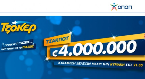 Τουλάχιστον 4.000.000 ευρώ περιμένουν σήμερα Κυριακή τους παίκτες του Τζόκερ, στην υπ' αριθμόν 1907 κλήρωση που θα γίνει στις 10 το βράδυ ενώ οι υποψήφιοι εκατομμυριούχοι μπορούν να καταθέσουν τα δελτία τους μέχρι τις 21:30 απόψε!
