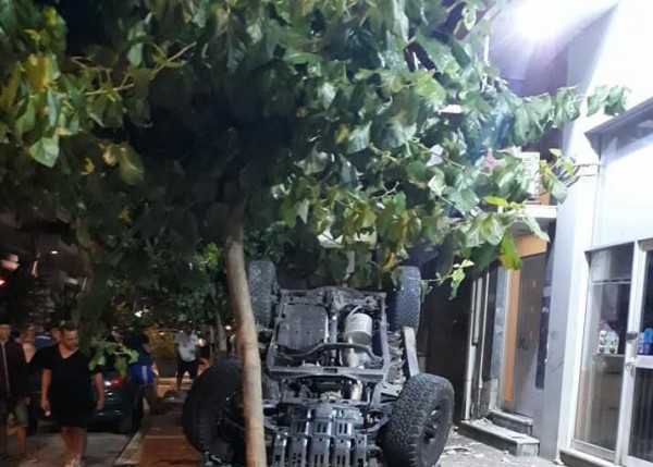 Αυτοκίνητο τζιπ με δύο νεαρούς επιβαίνοντες, κινούμενο στο ρεύμα ανόδου της Φαρών, για άγνωστο μέχρι στιγμής λόγο εξετράπη της πορείας του, πέρασε στο αντίθετο ρεύμα, και εκτός ελέγχου ανέβηκε στο πεζοδρόμιο και παρέσυρε τον μεταλλικό στύλο στάσης λεωφορείου, μια ζαρντινιέρα του Δήμου, ξήλωσε την πρόσοψη ενός Κρεοπωλείου, την μαρμάρινη πρόσοψη και το σκαλοπάτι μιας πολυκατοικίας και προσγειώθηκε ανάποδα πάνω στο πεζοδρόμιο.