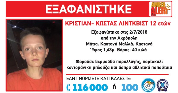 Πιο συγκεκριμένα, στις 2/7/2018, στις 00:00 π.μ., εξαφανίστηκε ο Κρίστιαν-Κώστας (ον) Λίντκβιστ (επ) 12 ετών από την περιοχή της Ακρόπολης. Για την εξαφάνιση του Κρίστιαν-Κώστα "Το Χαμόγελο του Παιδιού" ενημερώθηκε το μεσημέρι και λίγο αργότερα εκδόθηκε σήμα Amber Alert.