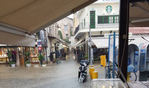 Η νεροποντή ξεκίνησε το μεσημέρι και η Πυροσβεστική Υπηρεσία δέχθηκε δεκάδες κλήσεις πολιτών που ζητούσαν συνδρομή για να απομακρυνθούν τα νερά από ισόγεια και υπόγεια.