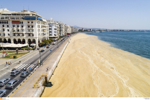 Για μία ακόμη φορά, η θαλάσσια περιοχή του Θερμαϊκού έχασε το βαθύ γαλάζιο της χρώμα και πήρε καφέ αποχρώσεις, καθώς η έντονη συγκέντρωση φυτοπλαγκτόν σε συνδυασμό με τα λύματα του αποχετευτικού δικτύου της Θεσσαλονίκης είχε το παρακάτω αποτέλεσμα.