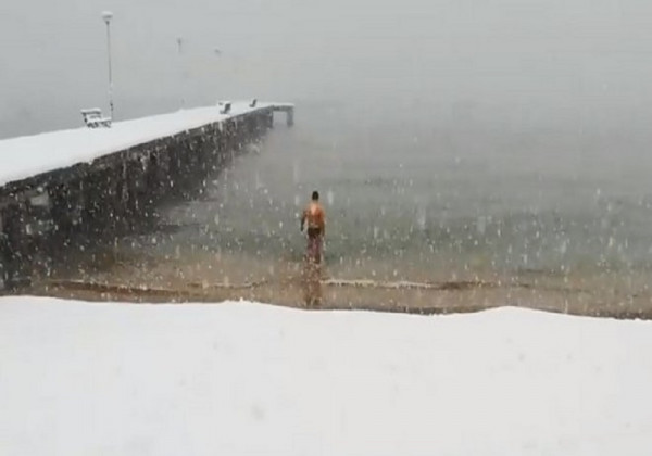 Ένας τολμηρός χειμερινός κολυμβητής αποφάσισε να προσπεράσει την παγωνιά, τη σφοδρή χιονοθύελλα και το τσουχτερό κρύο και βούτηξε στα παγωμένα νερά της Χαλκιδικής εν μέσω χιονοθύελλας.