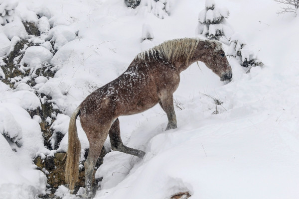 Στα χιονισμένα βουνά της Σαμαρίνας, άγρια άλογα έκαναν την εμφάνισή τους και ο φωτογραφικός φακός τα απαθανάτισε.