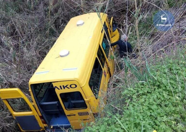 Ο οδηγός σχολικό λεωφορείου που κινούνταν χωρίς επιβάτες από το Τσαΐρι με κατεύθυνση το αεροδρόμιο, ξέφυγε από την πορεία του, πέρασε στο αντίθετο ρεύμα κυκλοφορίας και το λεωφορείο κατέληξε σε ρέμα με καλαμιές, βάθους τριών τουλάχιστον μέτρων.