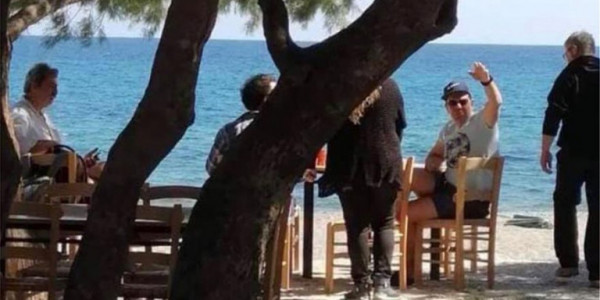 Ο Αλέξης Τσίπρας, κάνει νόημα σε κάποιον, ενώ μπροστά του βρίσκεται προφανώς η σερβιτόρα του καταστήματος, πίσω του ένας ακόμη σερβιτόρος, ενώ στην άλλη άκρη του τραπεζιού, διακρίνεται ο Παύλος Πολάκης.