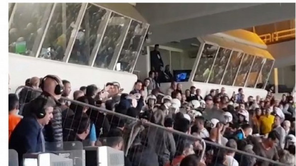Οι οπαδοί των δύο ομάδων πήραν θέση στα επίσημα, τα οποία χωρίστηκαν στα δύο με διμοιρίες ανάμεσά τους. Παρά τις εκκλήσεις που έγιναν από τα μεγάφωνα, καθώς σε αντίθετη περίπτωση θα γινόταν εκκένωση, οι δύο ομάδες οπαδών έμειναν στη θέση τους και κάποια στιγμή, κοντά στο 20', η σπίθα άναψε!