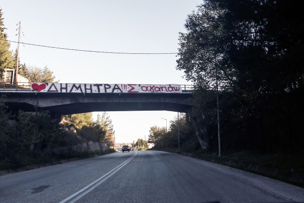 Έγραψε στο πανό, «Δήμητρα!!! Σ’ αγαπώ», με μεγάλα κεφαλαία γράμματα το όνομα της αγαπημένης του και ζωγράφισε και μια καρδιά καρφωμένη με ένα βέλος.