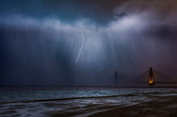 Εντυπωσιακή φωτογραφία που δείχνει την επιβλητική γέφυρα στο Ρίο - Αντίρριο, στις 18:30 το απόγευμα όταν κεραυνός «χτύπησε» τον πυλώνα Μ4 της γέφυρας.