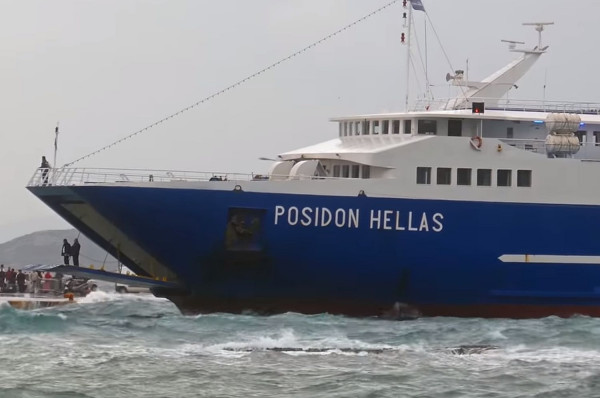 Στην περιοχή έπνεαν άνεμοι έντασης 7 μποφόρ και παρά τα μεγάλα κύματα ο καπετάνιος κατάφερε να «δέσει» στην πλαϊνή προβλήτα του λιμανιού.