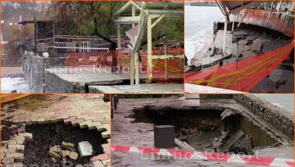 Όπως μετέδωσε το limnosreport, έπεσαν τμήματα του προστατευτικού τοιχίου, καθώς και προκλήθηκαν καθιζήσεις σε διαφορά σημεία εξωτερικών δομών καταστημάτων.
