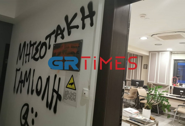 Παρέμβαση στο γραφείο του Σταυρού Καλαφάτη που βρίσκεται στο κέντρο της Θεσσαλονίκης πραγματοποίησε πριν από λίγο ομάδα νεαρών. Όπως μετάδωσε το grtimes πέταξαν τρικάκια και έγραψαν συνθήματα στους τοίχους. Εκείνη την ώρα δεν βρισκόταν κανένας στο γραφείο. Τα συνθήματα γράφουν «Κάτω τα χέρια από τον ΠΑΟΚ» , κατά της κυβέρνησής Μητσοτάκη και κατά του Αυγενάκη.