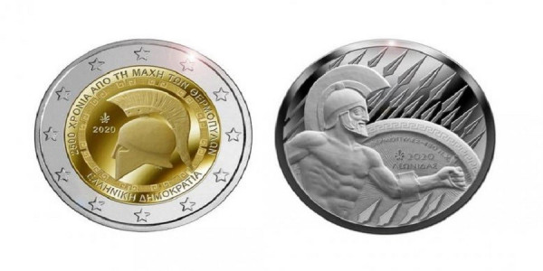 Στο νόμισμα των 2 ευρώ στην εθνική όψη απεικονίζεται αρχαίο ελληνικό κράνος. Περιμετρικά αναγράφονται οι λέξεις ««2500 ΧΡΟΝΙΑ ΑΠΟ ΤΗΝ ΜΑΧΗ ΤΩΝ ΘΕΡΜΟΠΥΛΩΝ» και οι λέξεις «ΕΛΛΗΝΙΚΗ ΔΗΜΟΚΡΑΤΙΑ». Το θέμα περιβάλλεται από διακοσμητικό μοτίβο. Στα αριστερά του κράνους αποτυπώνονται το ανθέμιο (σήμα του Ι.Ε.Τ.Α.) και το έτος κοπής.