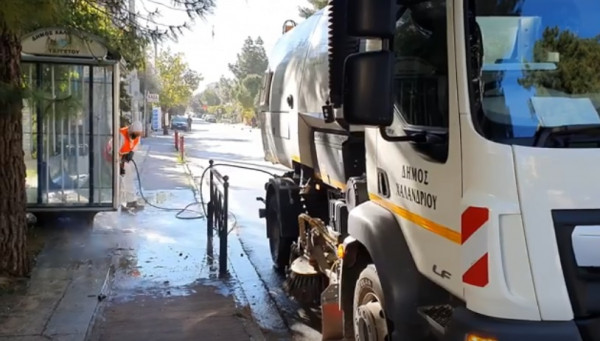 Όλο αυτό το διάστημα το προσωπικό της υπηρεσίας καθαριότητας με τη συνδρομή δύο πλυντηρίων, τριών νέων σάροθρων και δύο υδροφόρων απολυμαίνουν τους κάδους απορριμμάτων -7.000 σε όλη την πόλη- και επίσης παγκάκια, στάσεις λεωφορείων, πλατείες και σημεία συγκέντρωσης πληθυσμού, όπως οι χώροι μπροστά από τα σούπερ μάρκετ και τα φαρμακεία.