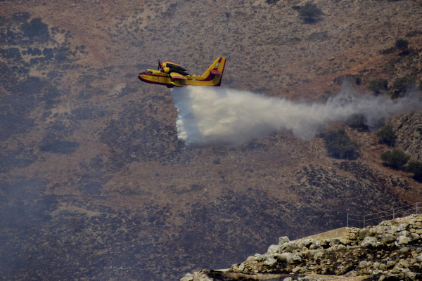 Στο πύρινο μέτωπο επιχειρούν 30 πυροσβέστες, με δύο ομάδες πεζοπόρων τμημάτων, 10 οχήματα, ενώ από αέρος στο έργο της κατάσβεσης συνδράμουν δύο αεροσκάφη και ένα ελικόπτερο.