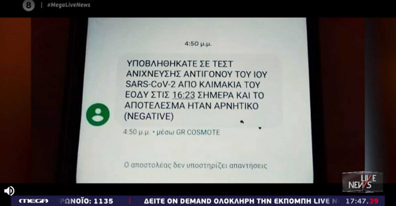 To επίμαχο sms με τα αποτελέσματα του τεστ του κορονοϊού που δεν έκανε ποτέ ανέφερε: «Υποβληθήκατε σε ΤΕΣΤ ανίχνευσης αντιγόνου του ιού Sars – Cov 2 από κλιμάκια του ΕΟΔΥ στις 16:23 σήμερα και το αποτέλεσμα ήταν αρνητικό».