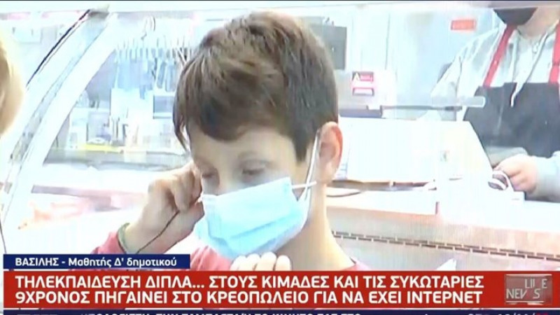 O μικρός Βασίλης πηγαίνει στο κρεοπωλείο της γιαγιάς και του παππού του για να έχει πρόσβαση στο Ίντερνετ και να συμμετάσχει στην τηλεκπαίδευση. Μάλιστα, σ' αυτή τη διαδικασία με κάποιο tablet ή ηλεκτρονικό υπολογιστή, αλλά με ένα smartphone που ανήκει στη γιαγιά του.