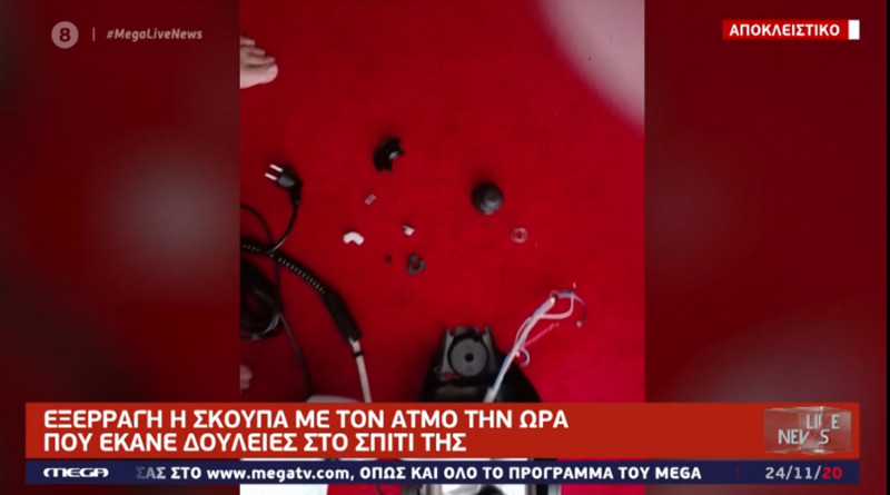 «Αυτή εδώ είναι η σκούπα που έσκασε… βλέπετε εδώ πέρα πώς έχει ανοίξει στη μέση… αυτά εδώ είναι τα κομμάτια… Κι εδώ όπως βλέπετε είναι το πόδι μου εδώ, που έχω πάθει το έγκαυμα…» είπε σοκαρισμένη η γυναίκα στο Mega.